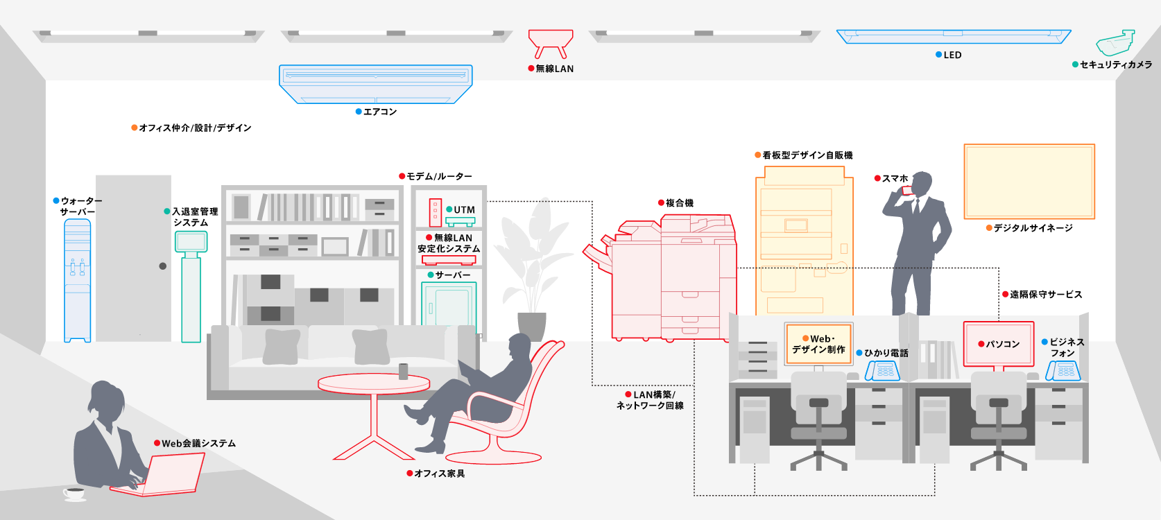 コピー機・複合機 / 遠隔保守サービス(biz-usクラウド) / 無線LAN / 無線LAN安定化システム(Tbridge) / Web会議システム / 勤怠管理 / PC・スマホ・タブレット / 業務効率化(RPA) / オフィス家具